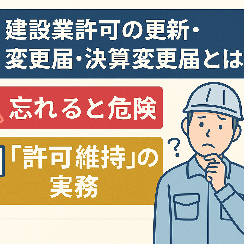はじめに:許可は「取った後」が本番! 建設業許可は、取得して終わりではありません。むしろ、許可を維持するための手続きこそが長期的に重要になります。 特に「更新」「変更届」「決算変更届」などは、忘れると営業停止や罰則の対象になることもあるた...